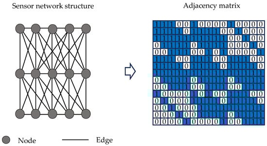 Following Equations (8) and (9) in Section 3.2, the adjacency matrix representing the spatial topology was constructed using the physical coordinates of the sensor deployment, as presented in Figure 8.