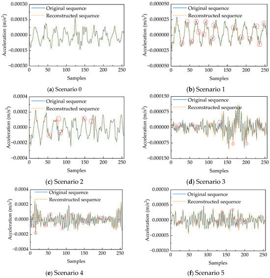 Comparison chart of the original and reconstructed accelerations of the same sensor under different case.