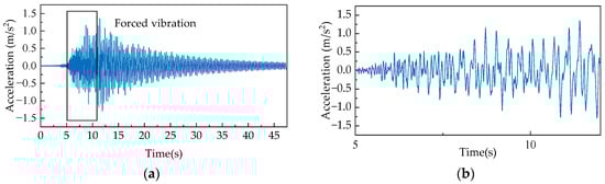 Environmental factors such as temperature and humidity introduce bias and drift errors in sensor measurements. To address this, Ordinary Least Squares (OLS) regression filtering was applied to eliminate the “systematic error” inherent to each sensor. Figure 7 demonstrates the signal comparison before and after filtering [44]. In this method, the specific size of the fitting window for the linear model varies between the training and test phases of the Z-24 bridge dataset: for the training data, the linear model is fitted using the entire time-series dataset of each sensor (i.e., all training data from a single sensor) to establish a baseline for correcting systematic errors; for the test data, the linear model is fitted independently for each data window (e.g., the same 256-sample window as used in real-time monitoring, consistent with the window configuration applied in subsequent analyses) to adapt to dynamic test conditions. Then, a signal free of drift and bias errors is obtained by subtracting the linear model from the data as follows: