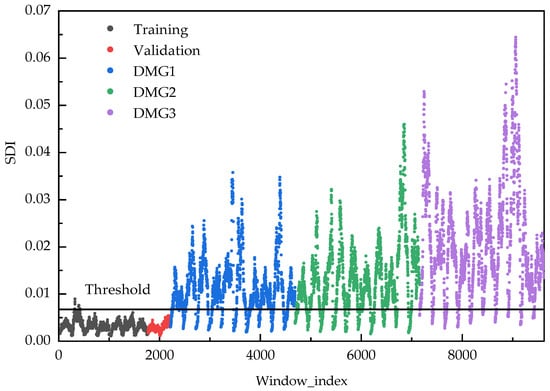 Figure 10 depicts the Structural Damage Indicator (SDI) distributions through five subplots corresponding to different damage scenarios. Each subplot illustrates the SDI spread using distinct markers: training set values under healthy conditions (black scatter), validation set values under healthy conditions (blue scatter), and measurements from specific damage scenarios (red scatter). The visualizations reveal pronounced distributional shifts between intact and damaged states.