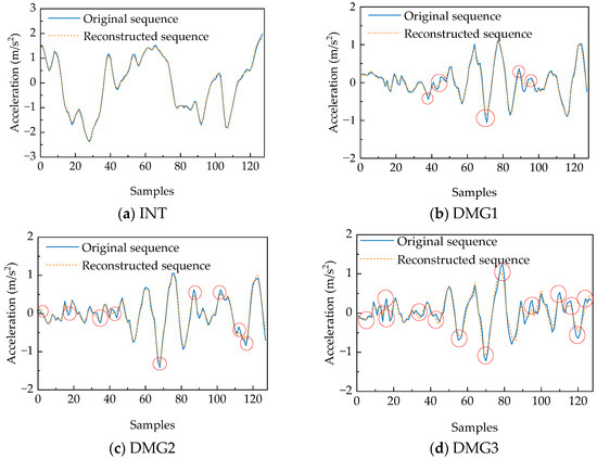Signal reconstruction performance across different conditions is illustrated in Figure 19. Under intact conditions (INT), the representative window achieves an MSE of 0.002589 with excellent reconstruction fidelity in waveform morphology, amplitude characteristics, and phase alignment. Damage scenarios exhibit progressively elevated MSE values (DMG1: 0.004319; DMG2: 0.004663; DMG3: 0.011997), with reconstruction errors predominantly localized at response extrema (peaks and troughs) as marked by red circles. The observed amplitude attenuation and phase distortion become increasingly pronounced with damage severity, demonstrating that structural damage alters dynamic characteristics and consequently degrades reconstruction capability. These findings validate the effectiveness of reconstruction-error-based damage assessment.