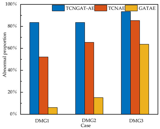 As demonstrated in Figure 20, TCNGAT-AE maintained consistent performance superiority across all damage scenarios. The model achieved an 83.53% anomaly detection rate under DMG1 conditions, representing significant improvements over TCN-AE (52.14%) and GAT-AE (6.16%). In the DMG2 scenario, it attained an 83.56% detection rate, exceeding both reference models (65.45% and 15.19%). For the most severe DMG3 condition, the framework reached a 93.44% detection rate, again outperforming both benchmarks (85.34% and 63.75%). Particularly notable is the 126% relative performance enhancement over GAT-AE in detecting minor damage (DMG1), highlighting the integrated architecture’s exceptional sensitivity to incipient structural deterioration. Experimental analysis further reveals the predominant importance of temporal characteristics under transient vehicular excitation, as evidenced by TCN-AE’s consistent advantage over GAT-AE. Nevertheless, through effective spatiotemporal feature integration, TCNGAT-AE achieved additional performance gains of 60.2%, 27.6%, and 9.5% over TCN-AE for DMG1 through DMG3 scenarios, respectively, unequivocally validating the critical contribution of spatial correlation modeling to damage detection capability.