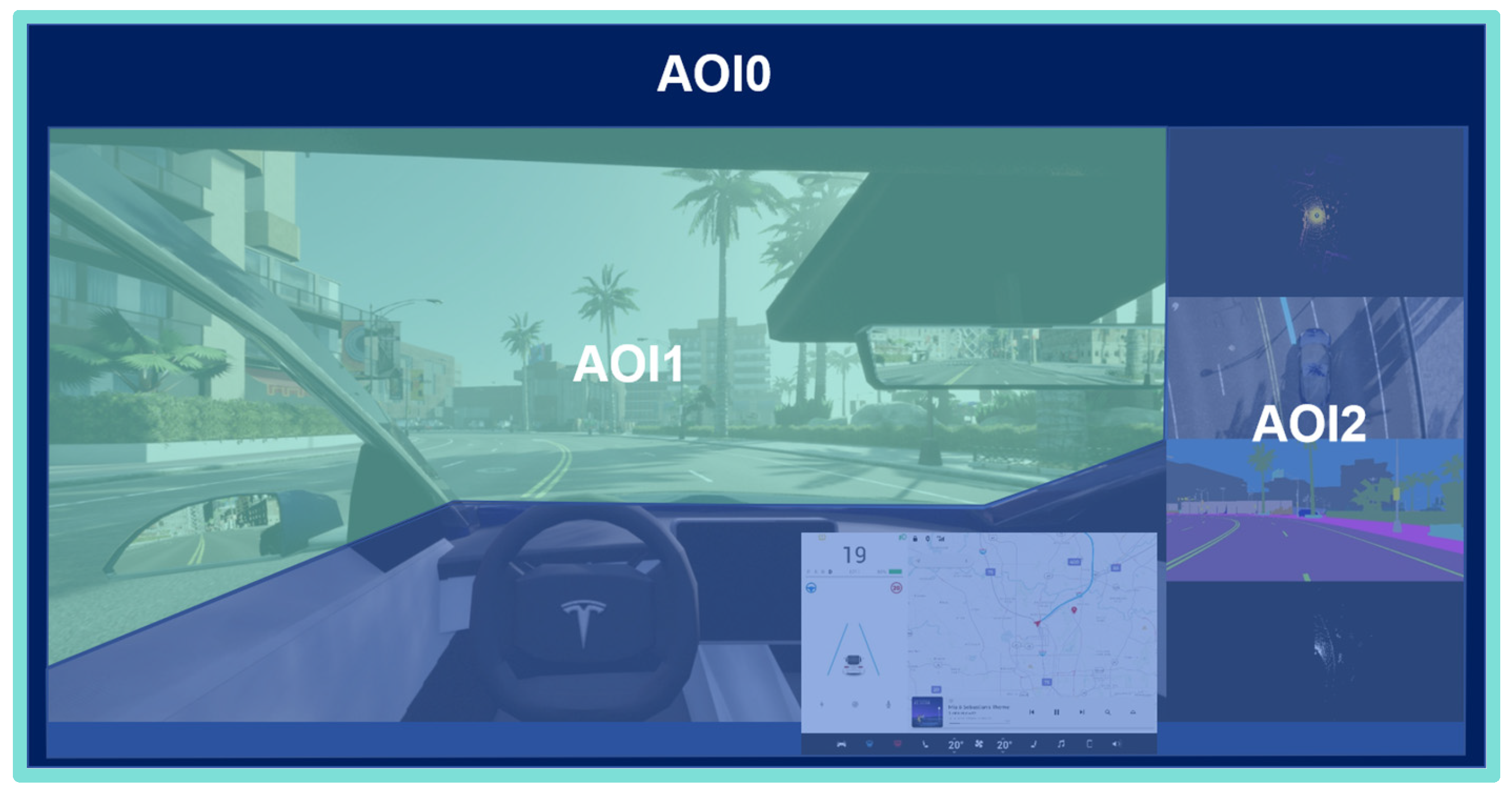 Considering the impact of visualization on the interactive characteristics of the entire autonomous driving system, the eye-tracking Area of Interest (AOI) was divided into three primary regions, as illustrated in
