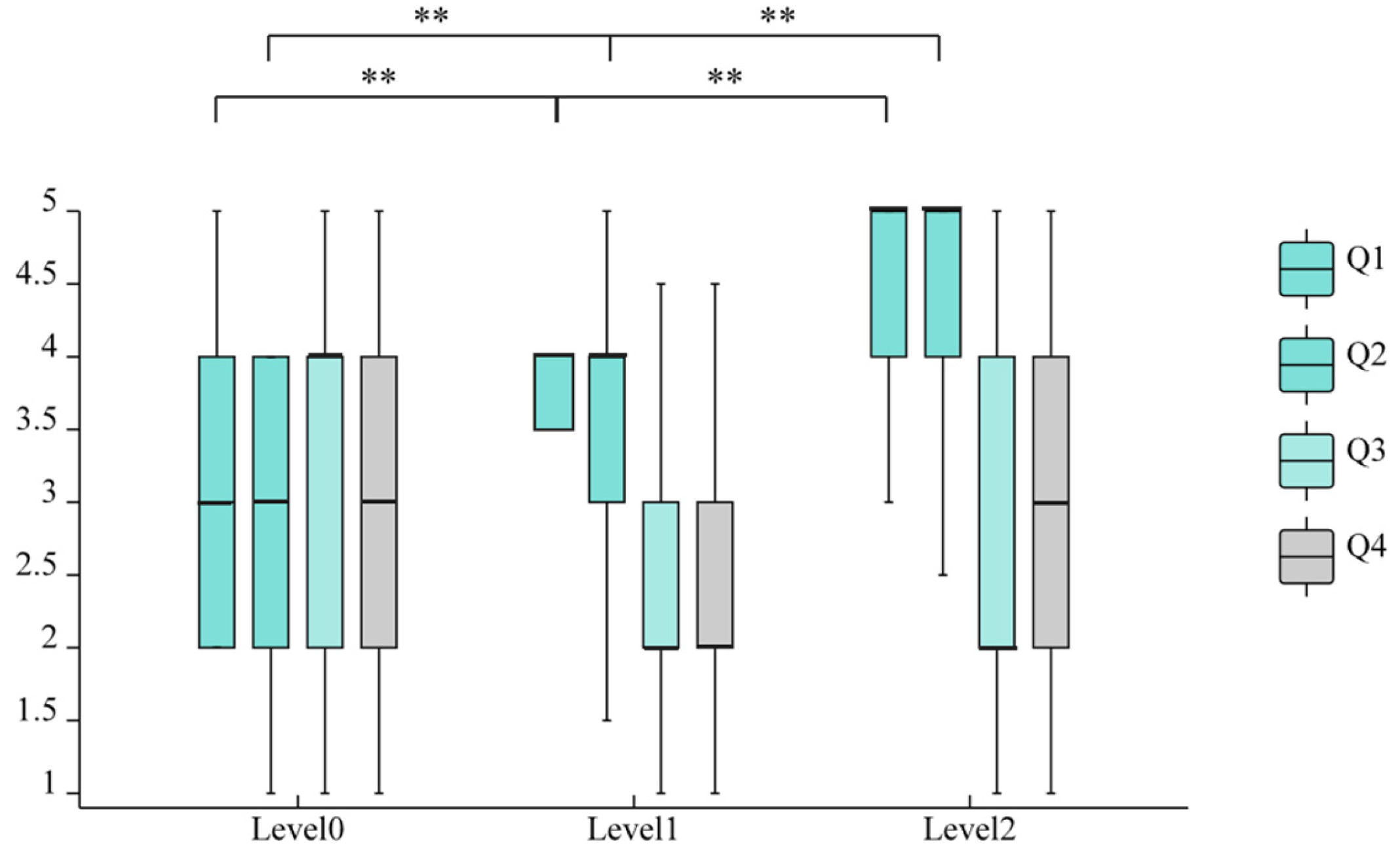 Guided by the Technology Acceptance Model, this study developed questionnaire items to assess users’ perceptions. Specifically, Q1 (“This system helps me complete driving tasks”) and Q2 (“The functions provided by this system are useful”) were designed to measure Perceived Usefulness (PU)—reflecting users’ subjective assessment of the technology’s ability to enhance task performance. Q3 (“I find this system difficult to use”) and Q4 (“I need to invest considerable effort to understand the system’s prompts”) were formulated to evaluate Perceived Ease of Use (PEOU)—capturing users’ perceived cognitive effort in operating the system. Notably, Q3 is reverse-scored. All items utilize a five-point Likert scale to systematically quantify subjective attitudes, facilitating a structured analysis of user acceptance toward multi-level visual driving assistance systems. To verify semantic appropriateness, we invited human factors (N = 7), engineering experts to conduct a content validity index (CVI) assessment, yielding a CVI score of 0.88. Additionally, a pre-test was carried out, which demonstrated a Cronbach’s α coefficient of 0.82.