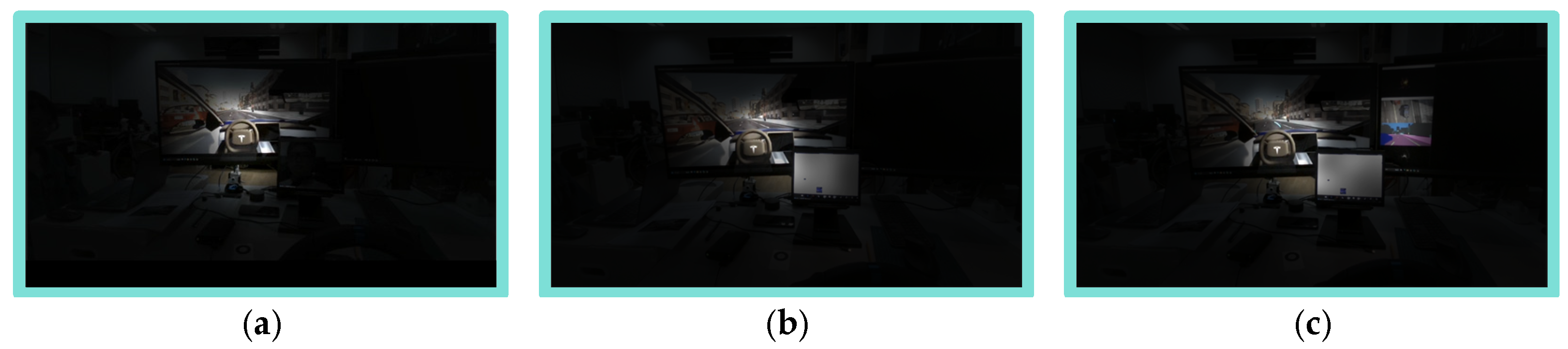 In this study, we designed three visualization conditions with varying levels of system transparency to systematically investigate how information presentation influences user trust and cognitive load. Level 0 (Black-box) displayed only the basic road driving scene, providing no information about the autonomous system’s status or intent. Level 1 (Standard) presented conventional driving information—such as vehicle speed and navigation cues—on the center console display located to the right of the steering wheel. Level 2 (Enhanced) extended the standard condition by overlaying an augmented reality (AR) semi-transparent blue dashed trajectory (extending 10 m ahead) onto the windshield and adding multimodal sensor visualizations—including LiDAR point clouds, 360° camera views, and semantic segmentation outputs—on the right-side console (see