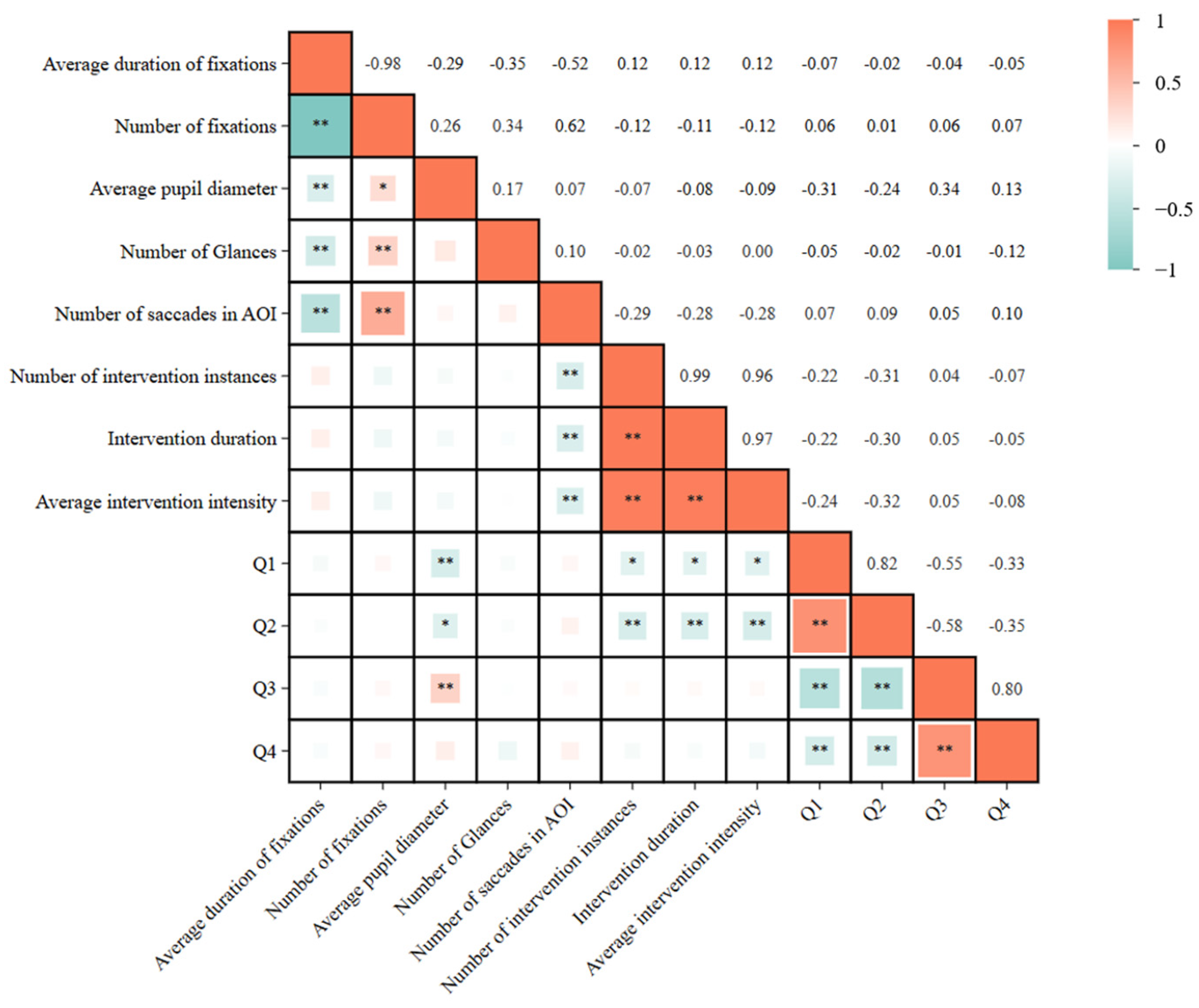 This study integrates subjective and objective data through Spearman’s rank-order correlation analysis: each item score from the TAM questionnaire (Q1–Q4) is pairwise correlated with eye-tracking metrics (fixation entropy, mean pupil diameter) and behavioral measures (intervention frequency, reaction time) to assess the consistency between users’ self-reported perceptions and their implicit cognitive–behavioral responses.
