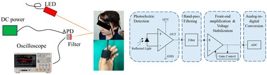 To capture a broader range of physiological signals, this paper designed a real-time PPG monitoring system that simultaneously acquires PPG signals from both the head and fingertip, establishing a dataset (PPG HAF) containing synchronized PPG signals from these two locations. The system principle is illustrated in Figure 1. The device comprises two independent photodetection units, fixed to the head and fingertip, respectively. Each detection unit incorporates an 850 nm central wavelength light-emitting diode (LED) light source and an avalanche photodiode (APD) detector, enabling non-invasive, continuous, and synchronous acquisition of PPG waveforms from both the head and fingertip. Signal acquisition is performed using a Keysight high-speed oscilloscope (Keysight, Santa Rosa, CA, USA) at a sampling frequency of 100,000 Hz.