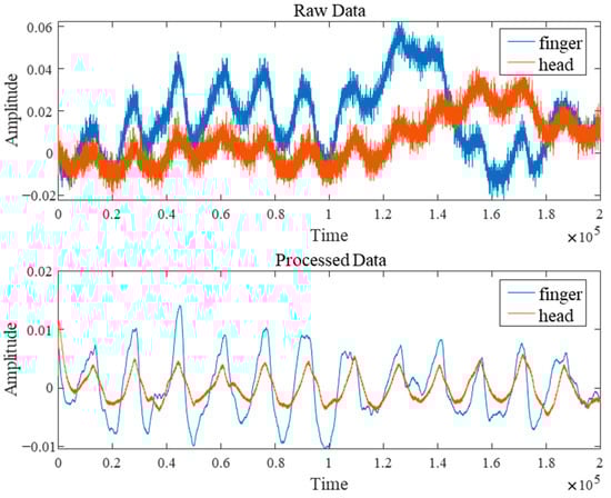 After the experiment, the raw data underwent rigorous noise-reduction filtering preprocessing comprising three steps. First, a cubic spline interpolation method was employed to eliminate abrupt noise spikes caused by body movement or poor device contact. Second, morphological operations effectively removed baseline drift from the signals. Finally, a Butterworth filter (passband range approximately 0.5–10 Hz) was applied to suppress high-frequency electronic noise interference. Figure 2 shows a comparison of the raw signal before and after noise filtering. These preprocessing measures significantly improved the signal-to-noise ratio of the PPG signal, providing reliable data support for subsequent deep learning model training.
