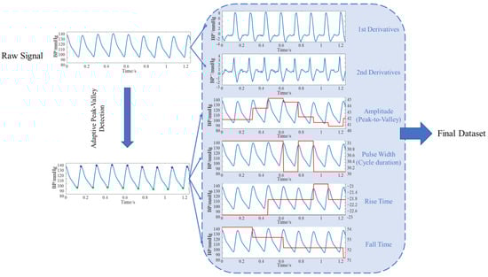 Abay et al. employed features such as PPG signal amplitude, pulse width, and rise/fall times to predict intracranial pressure [56]. This demonstrates that these characteristics are closely correlated with intracranial pressure, hence we have selected the same features. Considering that these features reflect periodic variations in the time domain, we further introduced first-order and second-order derivatives as additional feature values. First, the entire sequence was segmented according to cardiac cycles. Four key temporal parameters were extracted from each cycle: amplitude (peak-to-trough, reflecting pulsatile intensity), pulse width (interval between adjacent peaks/troughs, reflecting cycle length), rise time (trough to peak, reflecting contraction dynamics), and fall time (peak to next trough, reflecting diastolic decay). Additionally, we computed first- and second-order derivatives at each sampling point. The first derivative characterizes the rate of change in the signal, while the second derivative captures curvature information, highlighting points of abrupt change. These parameters effectively characterize key features of the periodic motion inherent in physiological signals. The overall workflow is illustrated in Figure 4.