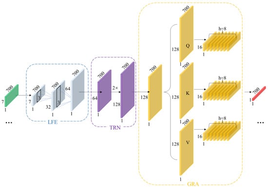 The schematic diagram of the deep temporal modeling network is shown in Figure 5, primarily divided into the following section: Local time-domain feature subnet (LFE), Long-Term Dependency Representation Subnet (TRN), and Global reweighting and alignment (GRN). The LFE aims to stably extract low-level features characterizing waveform geometric structures without sacrificing temporal resolution. To this end, this paper designs a two-layer lightweight feature extraction network LFE. The first layer can be understood as a combined approximation of the first-order local difference and smoothing of the input. The three-point neighborhood suppresses high-frequency random noise while preserving the local gradient information of rising/falling edges, as shown below:
