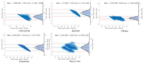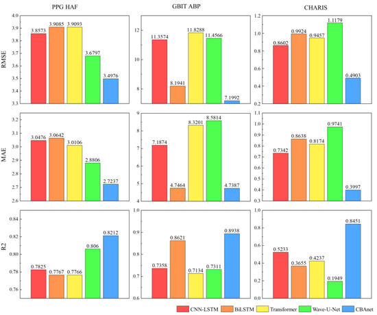 Table 2 summarizes the prediction performance of five models across three datasets, comparing results between raw data and preprocessed data . Experimental results demonstrate that data preprocessing effectively enhances the performance of all five model types. Post-preprocessing models exhibit consistent reductions in RMSE and MAE alongside sustained increases in R2, with CBAnet delivering particularly outstanding results on the CHARIS dataset: RMSE decreased by 45.9%, MAE by 50.3%, and R2 rose to 0.9345. These findings indicate that preprocessing mitigates phase mismatch and amplitude drift issues by explicitly extracting morphological and trend features related to the cardiac cycle. This enables models to simultaneously capture both local structural details and low-frequency background information, thereby significantly enhancing their generalization capabilities.