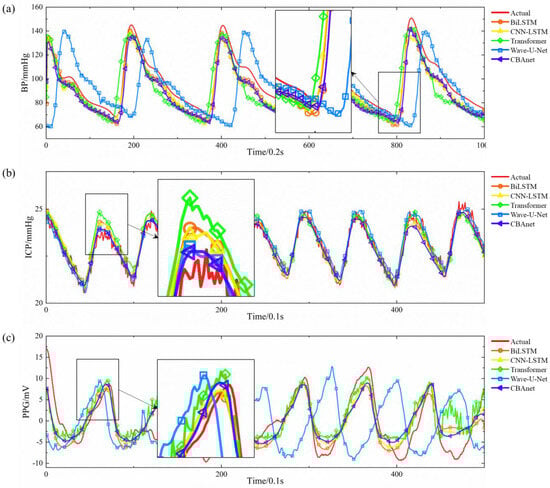 In recent years, deep learning has provided new approaches to address the aforementioned challenges by predicting signals that are difficult to obtain directly through traditional methods, using readily accessible physiological indicators. Convolutional neural networks (CNN) excel at extracting local features, making them well-suited for processing detailed patterns in waveforms such as PPG [15]. Long Short-Term Memory (LSTM) networks excel at capturing temporal dependencies and demonstrate outstanding performance in processing time-series signals such as heartbeat sequences and blood pressure fluctuations [16,17]. Attention mechanisms can highlight key features within vast amounts of information, enhancing the model’s focus on crucial temporal segments [18]. Transformers are better at extracting spatiotemporal information [19]. Wave-U-Net bypasses traditional time-frequency transformations by directly processing raw time-domain waveforms, thereby better preserving signal details and phase information. This makes it more suitable for end-to-end learning waveform generation [20]. Many researchers have conducted studies on this topic, such as using optical PPG signals to estimate continuous blood pressure [21,22]. Alternatively, predicting ICP through BP measurements enables early warning of intracranial hypertension [11,23].