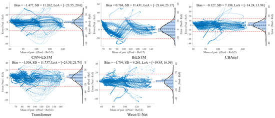 To more effectively model the temporal dependencies of physiological signals, Long Short-Term Memory (LSTM) networks and their variants have been introduced. Zhang et al. proposed a method employing bidirectional LSTMs (BiLSTM) combined with demographic information, demonstrating good accuracy across different cardiovascular disease cohorts [29]. However, the generalizability of this approach may be constrained by dataset scale and diversity. The U-Net architecture, with its encoder–decoder structure and skip connections, has demonstrated strong performance in signal waveform reconstruction tasks. Athaya and Choi pioneered the application of U-Net for non-invasive arterial blood pressure waveform estimation, demonstrating accuracy comparable to conventional cuff-based methods [30]. A limitation lies in the model’s potentially poor adaptability across different patients, with constrained robustness in complex clinical scenarios such as acute condition changes. Subsequent research, such as the Wave-U-Net model proposed by Lei et al., has successfully been employed to reconstruct intracranial pressure waveforms from arterial blood pressure signals, validating the architecture’s advantages in integrating multi-scale contextual information with local details [31]. In recent years, Transformer models have garnered attention for their robust global context capture capabilities. Ma et al. employed a Transformer architecture combined with knowledge distillation techniques, achieving excellent results in cuffless blood pressure estimation [32]. Ma et al. further innovated by employing a Transformer-based transfer learning approach, demonstrating robust performance across diverse datasets [33]. However, Transformer-based methods typically rely on substantial training datasets, and their transfer learning strategies impose stringent requirements on data quality and features, rendering their application to small-sample datasets challenging.