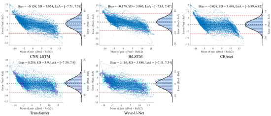 To validate the effectiveness of the proposed model, we compare it with four commonly used models: BiLSTM [57], CNN-LSTM [4], Transformer [22], and Wave-U-Net [58]. BiLSTM employs bidirectional recurrent layers to simultaneously model past and future dependencies in the temporal dimension, representing a classic sequence modeling approach. It is particularly effective at capturing rhythmic information such as the morphology of cardiac cycles and respiratory modulation. CNN-LSTM first extracts local features (e.g., wave peaks, rising edges) via front-end convolutions, then aggregates global temporal patterns through long-short term memory networks, enabling better utilization of local feature characteristics than pure LSTM. Transformers establish long-range dependencies through self-attention, making them better suited for modeling correlations spanning multiple cardiac cycles. Wave-U-Net employs a multi-scale encoder-encoder architecture to achieve end-to-end “waveform-to-waveform” mapping, simultaneously capturing local transients and global trends, making it ideal for end-to-end modeling of physiological signals.