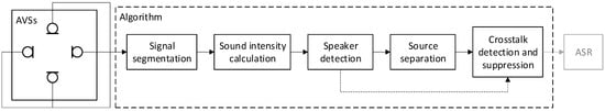 An overview of the proposed algorithm is presented in Figure 1. The consecutive processing stages, starting with acquiring input streams from the sensors and finishing with passing the processed (crosstalk-free) streams to an ASR system, will be presented in the following subsections. The actual speech recognition is not a part of the proposed algorithm; it is realized by an external ASR system.