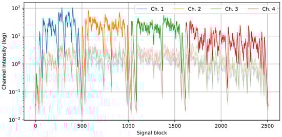 Channel intensity Ich plots for an example recording in which four speakers were active in turns. Dark colors indicate the signal fragments during which the channel was dominant, light colors—the remaining signal parts.