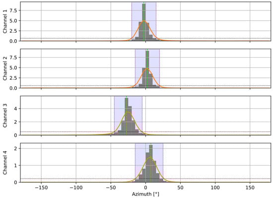 Azimuth histograms calculated for the same recording as in Figure 2. Gray bars show raw histogram values, orange lines—smoothed histograms. Horizontal dotted lines are the detection thresholds. Vertical dotted lines and the violet background indicate the detected modes (azimuth ranges) for the individual speakers.