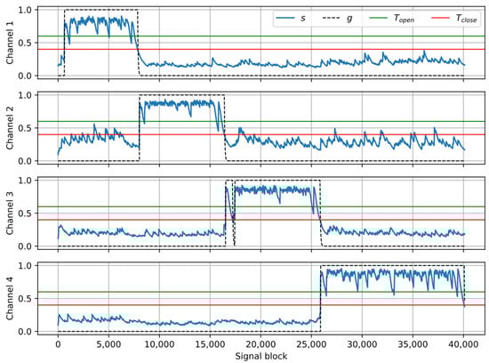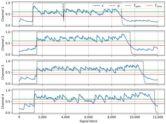 Example of signal analysis with the crosstalk gate algorithm: smoothed coverage s, threshold values Topen, Tclose; output gain g.