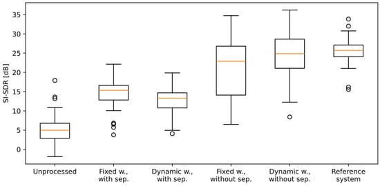 Despite the issues discussed above, it was decided to use SI-SDR for the algorithm evaluation, as it is the metric widely used by most of the researchers, and there is no other standard metric that would avoid the discussed problems. It would be possible to perform the recordings in an anechoic room, and it is expected that the SI-SDR for the algorithm performing the source separation would be higher. However, the purpose of the experiments was to evaluate the algorithm in real-world conditions, in a reverberant space. The conclusion is that the SI-SDR metric does not provide full information on the suitability of the processed signals for the speech recognition task. The experiments presented in the previous publication [] indicate that the proposed source separation procedure does not impair speech recognition accuracy, and these observations may be extrapolated to the algorithm described here. Listening to the recordings processed with the algorithm confirmed that direct speech remains intelligible, and the preliminary results of ASR testing with WhisperX 3.3.1 confirmed that the proposed algorithm allows for accurate speech recognition. Formal tests on this subject are planned for future research, because testing the ASR accuracy is outside of the scope of this paper. It may be concluded that the proposed algorithm in the version performing source separation provides a statistically significant increase in SI-SDR over the unprocessed signals.