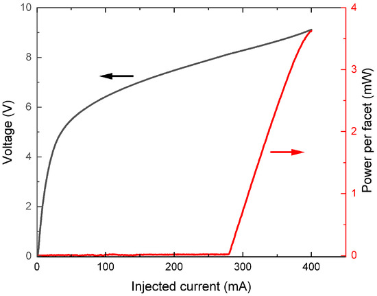 The QCL, fabricated by molecular beam epitaxy in the InAs/AlSb material family [22], operates in continuous-wave (CW) regime over the temperature range −10 °C to 5 °C, with a side mode suppression ratio (SMSR) of 20 dB. Figure 1 presents its emitted power and voltage as a function of the injected current in the continuous wave regime at 2 °C. Further measurements are performed using the laser operating at this temperature, where the threshold current value is 280 mA, and the maximum output power reaches 3.6 mW at 400 mA.