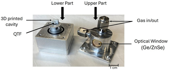 The laser chip is enclosed in a homemade mounting and connected to a current driver and temperature controller (Thorlabs ITC4005 QCL). The temperature regulation is performed with a PT100 temperature sensor and a Peltier cooler. A water-cooling system is used for heat dissipation of the Peltier cooler at low temperatures. The laser mount is closed under dry nitrogen to avoid any water condensation on the chip. The emitted beam of the laser passes through a KBr window (transmission ) and is collimated into the gas cell by the mean of a black diamond lens (Thorlabs C028TME-F) of focal length mm. The window of the gas cell (transmission at 11 μm) is made of coated germanium (3–12 μm) to minimize the laser power losses occurring at this stage. Into the gas cell, the laser beam is focused inside a 3D printed acoustic cavity designed and adjusted to reach the resonance frequency of a commercial tuning fork ( Hz). The experimental QEPAS setup follows the design of [23], with a more compact gas cell (Figure 2), which reduces the analyzed volume and the reaction time of the setup.