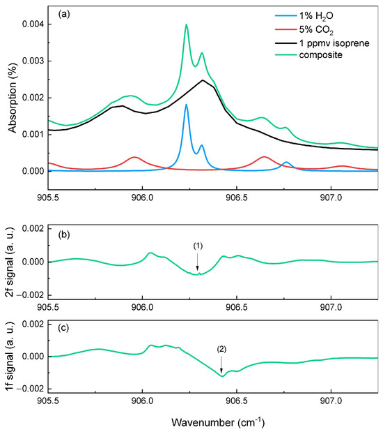 and CO2) [25,26]. While CO2 and H2O can reach concentrations of about 5% in exhaled air, the use of a Nafion tube (BE series Moisture Echangers) in our measurement setup significantly reduces the H2O concentrations to around 1%. This tube, provided by the Permapure company, is made of Nafion membranes that effectively decrease humidity in a gas mixture. Nafion is a polymer of Teflon with a fluocarbon and sulfonic acid side chains. When a humidified air flows through the Permapure tube, the water is absorbed by the sulfonic group. Then, the water diffuses to the environment creating an equilibrium between the mixture and the ambient level of humidity (around 1%). Therefore, these values were used in the simulations to accurately reflect the measurement conditions. Figure 3a shows the absorption lines of isoprene (black), CO2 (red) and H2O (blue) at concentrations of 1 ppmv, 5%, and 1%, respectively, over a 1 cm path length at ambient temperature and pressure conditions. The green curve represents the composite spectrum resulting from the sum of these three gases, showing the spectral overlap between them. The strongest peak of this composite profile, at cm−1, results from the combined contributions of isoprene and H2O. However, the slope of this peak at cm−1 follows the absorption profile of isoprene without interference with other gases. The contribution of CO2 is about five times weaker than that of water, making it negligible and far from the target region.