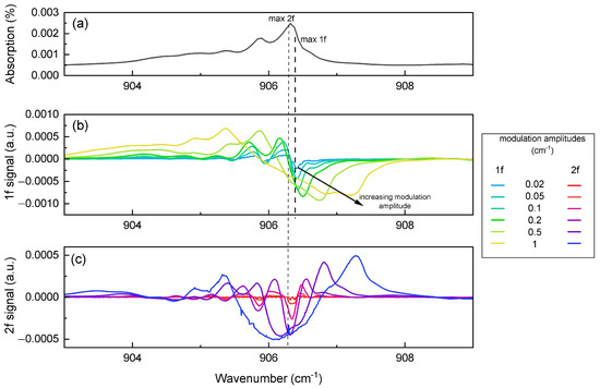The modulated frequency can be expressed as , where is the modulation amplitude. We consider that when the laser is modulated, the emitted power remains constant. The absorption coefficient of the gas is calculated by expansion of the absorption function in a Fourier series [28,29]. Figure 3b,c display the simulated 1f and 2f QEPAS signals corresponding to the first and second derivatives of the composite absorption spectrum. These simulations were done by using a small modulation amplitude corresponding to a = cm−1 in wavenumber.