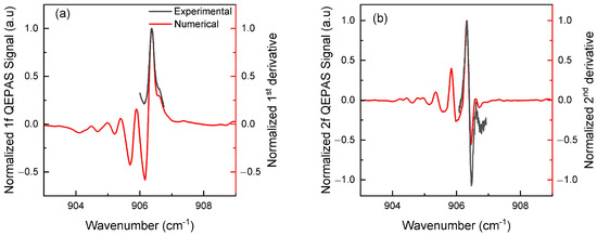Figure 5 compares the measured (black) and numerically simulated (red) QEPAS signals of isoprene for both 1f and 2f components, using a modulation amplitude of 0.1 cm−1. Both harmonics (1f and 2f) show good agreement between the measurements and simulations in terms of shape and width. The first lobe of the 1f signal appears around 906.4 cm−1, while for the 2f signal, the secondary (negative) lobe is located near 906.5 cm−1 and the main (positive) lobe around 906.3 cm−1. Other lobes clearly seen in the simulations beyond the main lobes are not visible experimentally, mainly due to the laser’s current limitations (Figure 1).