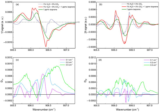 This parameter D represents the contribution of isoprene to the total QEPAS signal by subtracting the background response of H2O and CO2. A larger D value indicates that the isoprene response is more distinct and less affected by interfering gases, while smaller values suggest stronger interference. We calculated D for several modulation amplitudes (0.1, 0.2, and 0.5 cm−1) in both 1f and 2f modes. The results, shown in Figure 6c,d, plot D as a function of wavelength. These plots allow the identification of the (i) modulation amplitude and (ii) wavelength regions where the isoprene sigature is maximized relative to the background.