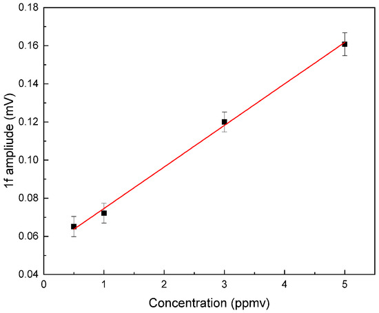 Following the selection of the 1f detection mode to minimize water effect and a modulation amplitude of 25 mA, we proceed to evaluate the limit of detection of the sensor as well as its linearity through gas calibrations measurements. Isoprene concentrations ranging from 0.5 to 5 ppmv are prepared in Tedlar bags by diluting a 50 ppmv calibrated gas bottle using a gas mixing system (GasMix-2 Aiolos). This system, equipped with mass flowmeters, provides controlled dilutions in dry nitrogen at atmospheric pressure with a constant flow of 250 mL/min. The measured 1f signal amplitude as well as the associated standard deviation are presented in Figure 7. The lock-in time constant is set to 500 ms. A non-zero background of 0.05 mV (no gas) is observed in 1f configuration as the sensor is most sensitive to photothermal induced and cavity walls noises.