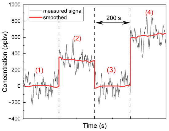 Measured isoprene concentrations from one single healthy male volunteer (30 years, 75 kg bodyweight) under five conditions, each lasting 200 s: (1) nitrogen baseline, (2) breath at rest, (3) nitrogen, (4) breath during exercise. The black curve represents the raw signal and is used to calculate the signal’s noise at each phase, and the red line shows the smoothed trend for each phase.