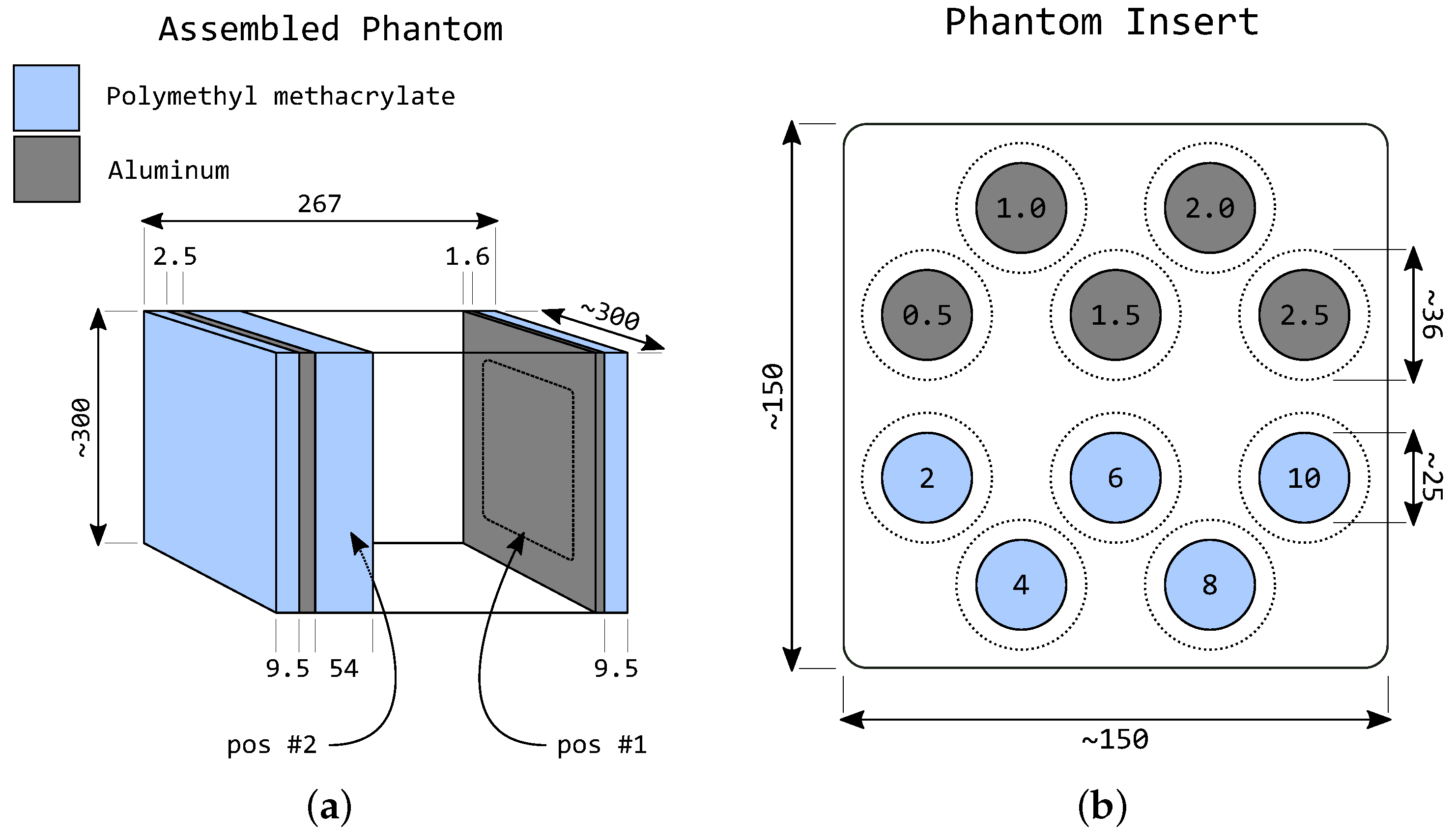 Schematic representation of the modeled LucAl-based chest phantom used in simulations. All dimensions are in millimeters. (a) Simulated phantom geometry for the average chest size configuration; (b) Simulated arrangement of PMMA and aluminum cylindrical inserts.