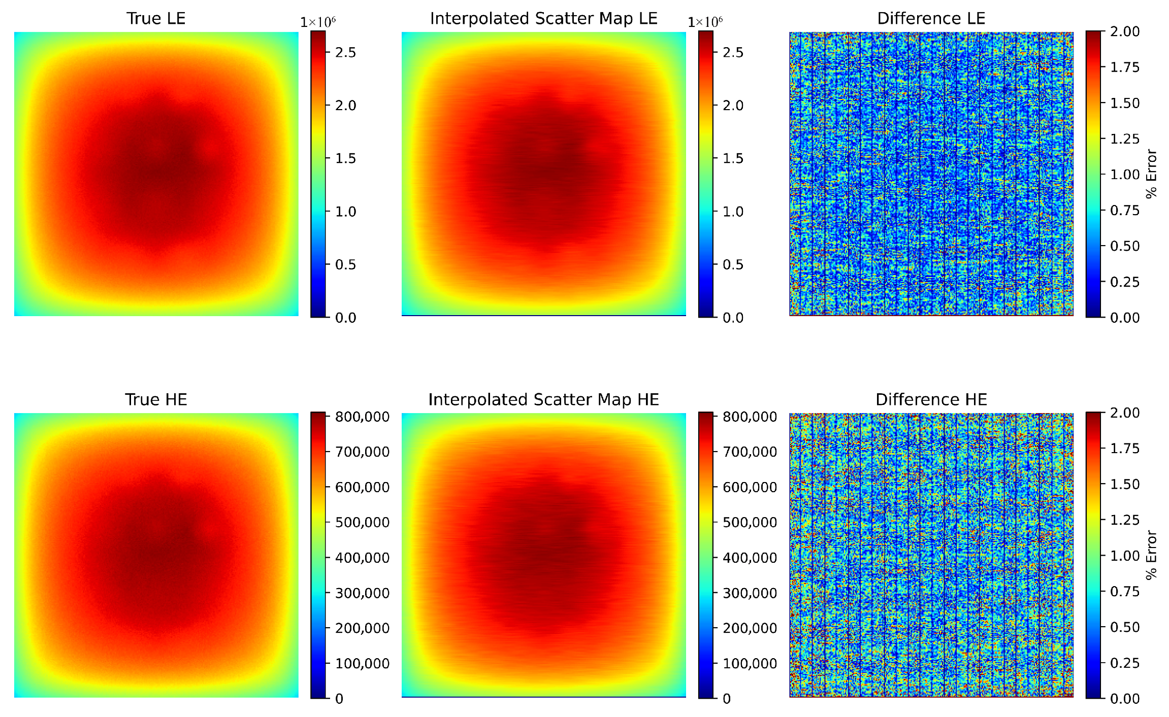 Figure 2 presents an example comparison for the standard phantom size. The difference map shows that the error is below 1% for all pixels, with an average error of 0.4%.