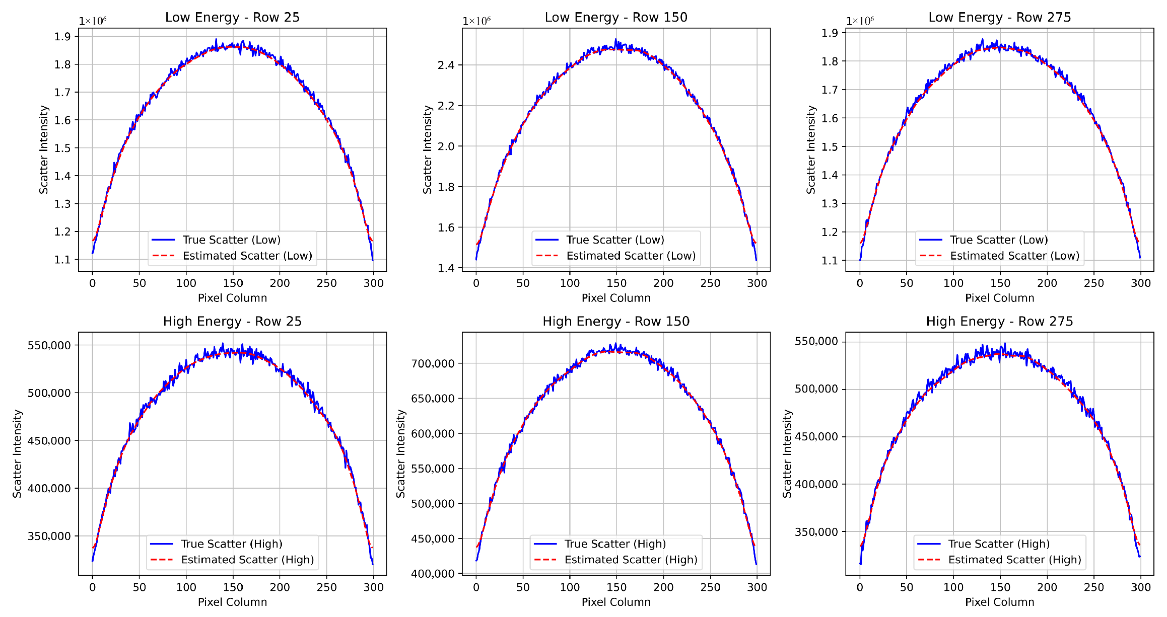 To further assess the accuracy of scatter estimation, we extracted 1D profiles at different rows in the low-energy (LE) and high-energy (HE) simulated scatter maps.