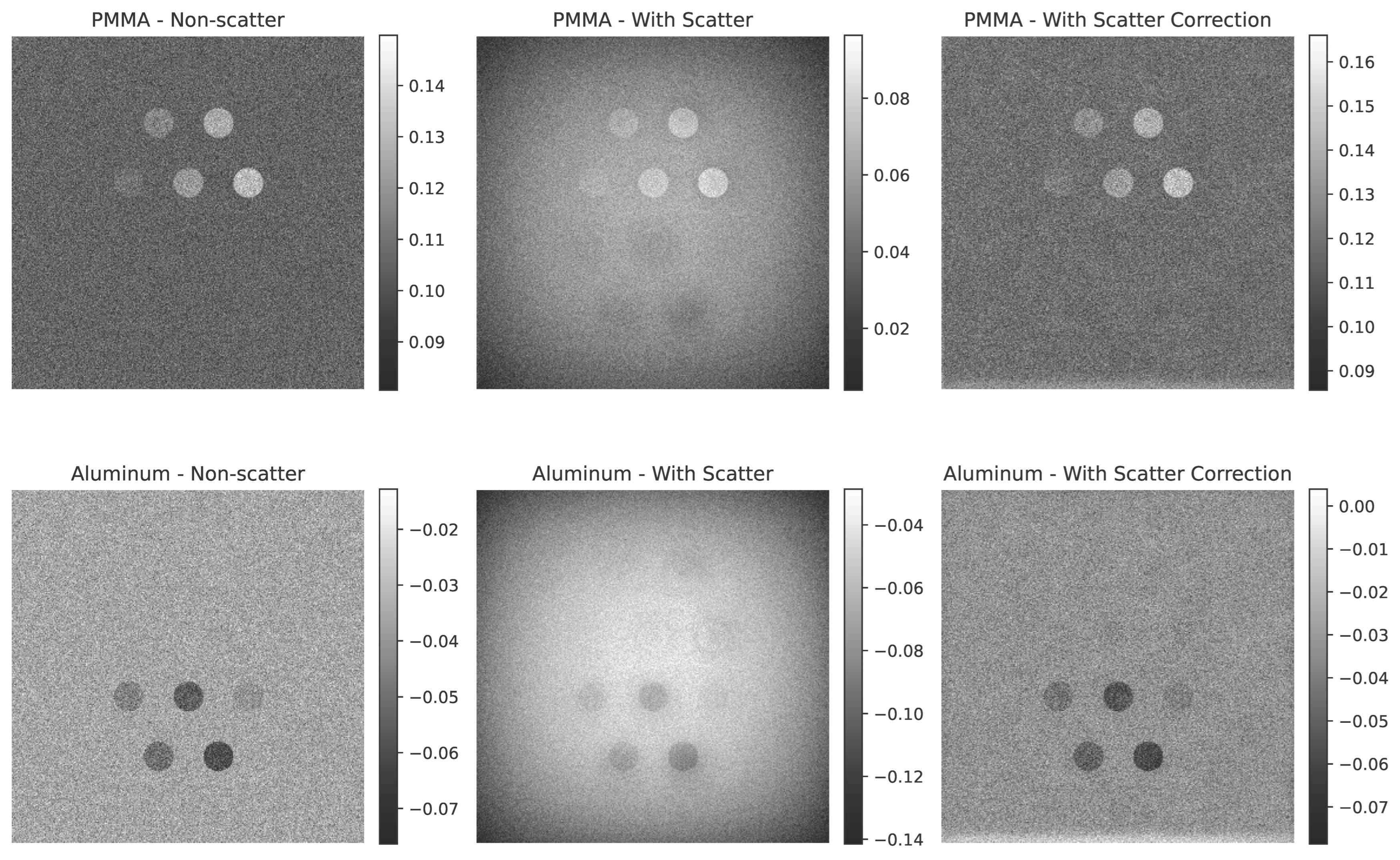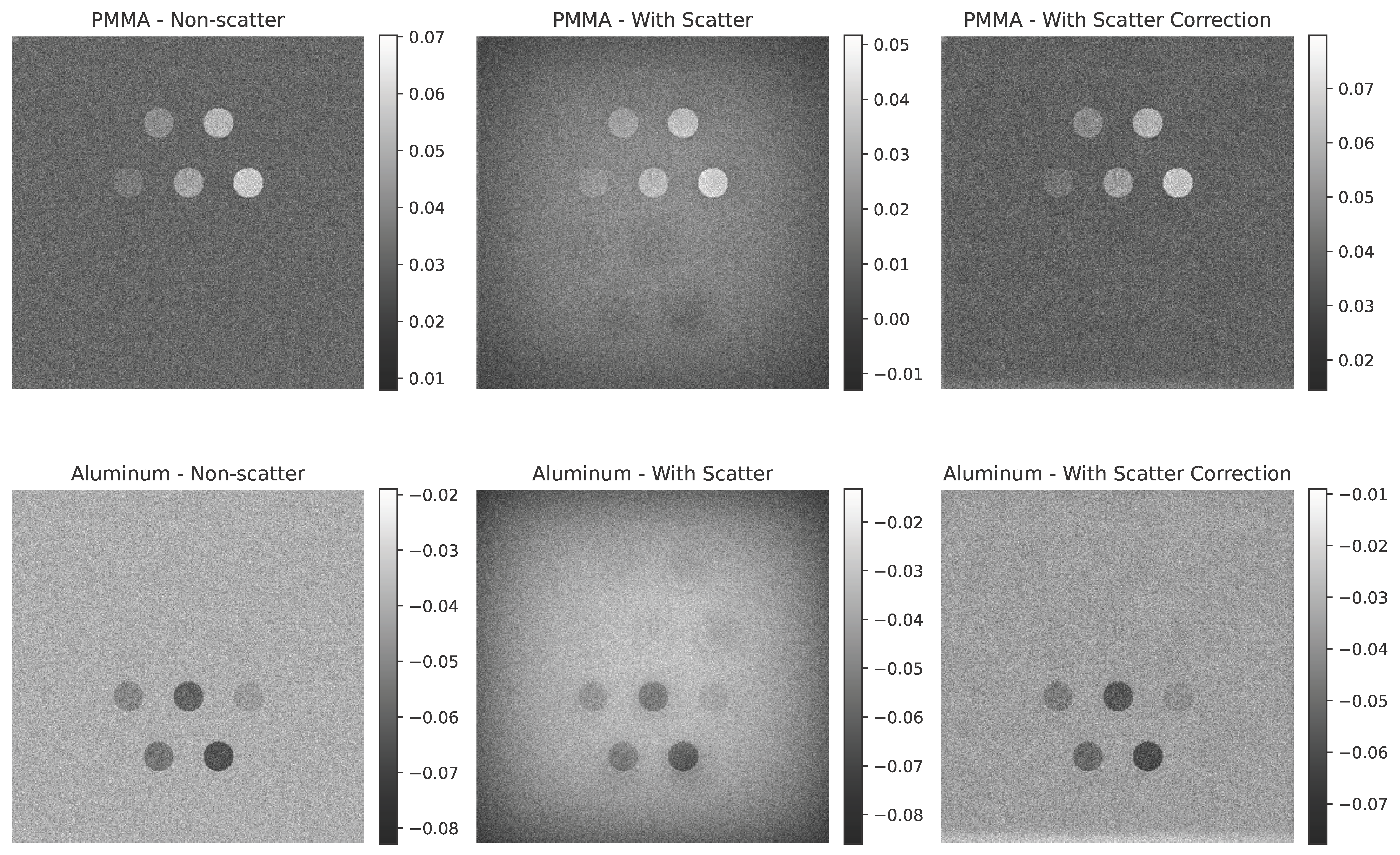 Figure 6 illustrate the impact of scatter on the simulated dual-energy subtraction images for the standard, small, and large phantom sizes, respectively. In the absence of scatter (top row), the soft tissue (PMMA-enhanced) and bone (Al-enhanced) subtraction images exhibit ideal material separation. In the presence of scatter (middle row), artifacts appear at the edges of the inserts, particularly in the Al-enhanced images. After applying scatter correction (bottom row), these artifacts are significantly reduced, restoring the desired contrast. For visualization, grayscale intensity ranges were scaled between the minimum and maximum values of each image to maximize contrast, as the dual-energy subtraction images are qualitative and not intended for quantitative comparison.