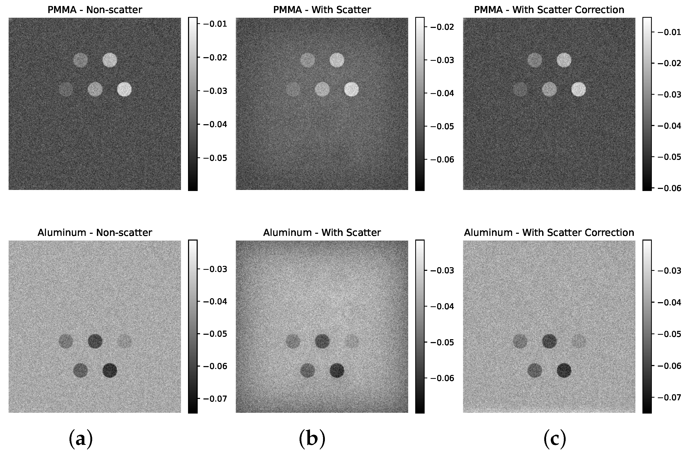 Simulated dual-energy subtraction images for PMMA (top) and Al (bottom) inserts in the standard phantom size under three conditions: (a) without scatter, (b) with scatter, and (c) after scatter correction. Scatter-induced artifacts are evident in the second row, especially in the Al-enhanced images, but are effectively removed after correction.