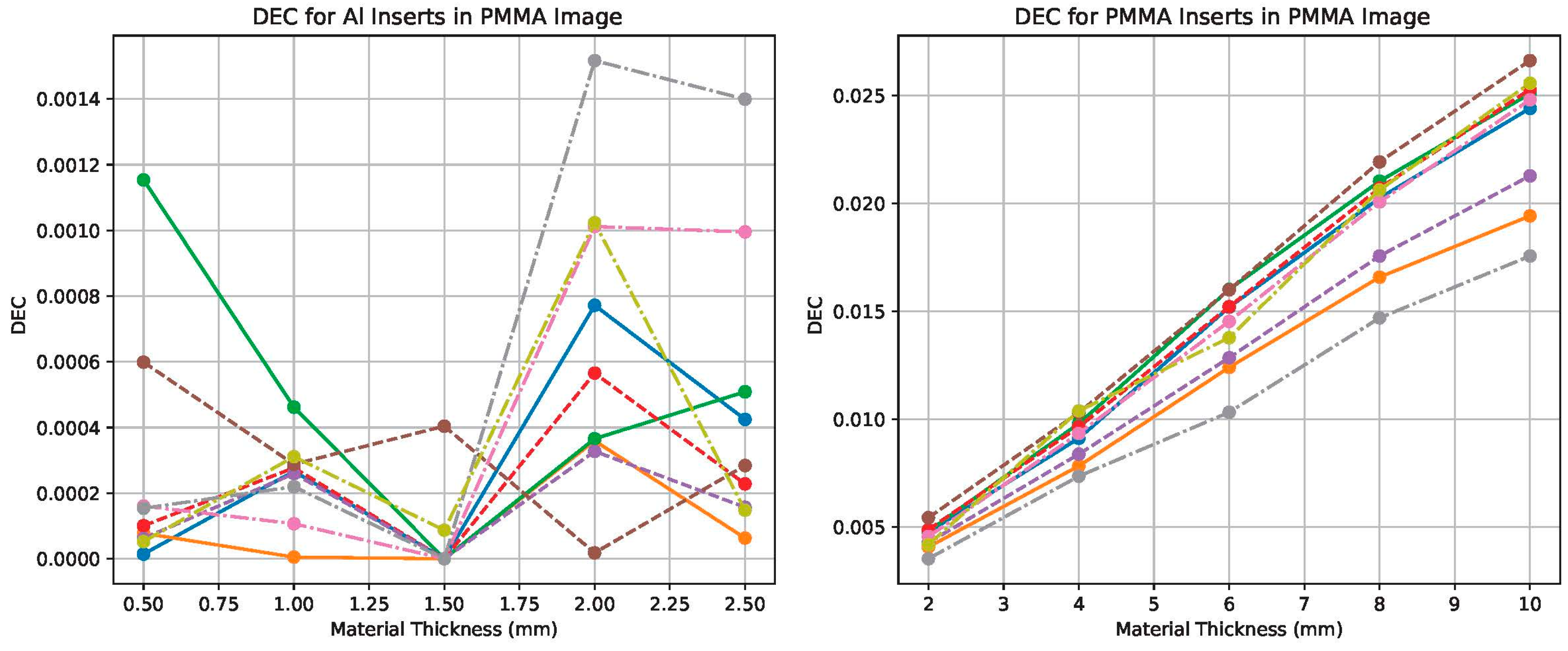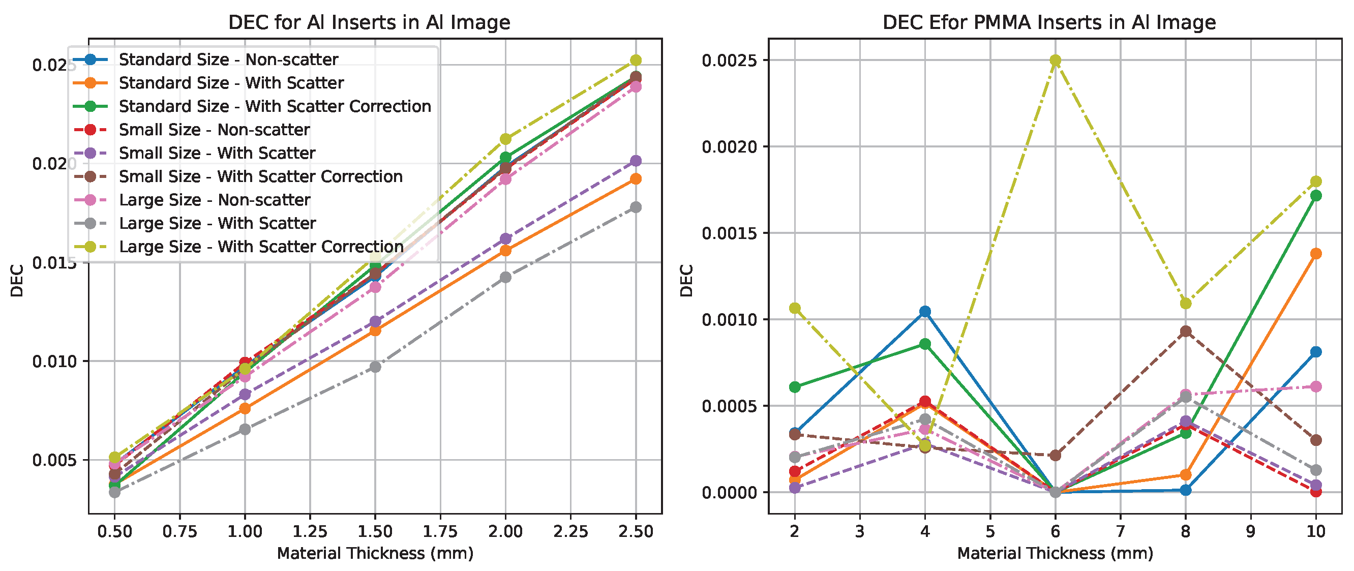Figure 7), the DEC for Al inserts increases approximately linearly with insert thickness and improves by up to 25% after scatter correction. For the PMMA-enhanced image (
