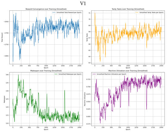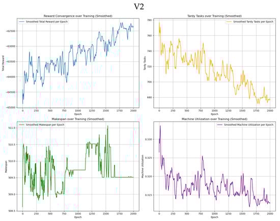The GA-HPO PPO and PPO algorithms were trained on four datasets: two with dimensions of 5 × 100, and two with dimensions of 30 × 1000. Each dataset was trained for 2000 iterations using the PPO algorithm and 1000 iterations using the GA-HPO PPO algorithm. For both algorithms, convergence curves (Figure 5, Figure 6 and Figure 7) were obtained for the total reward, number of overdue tasks, total completion time, and machine utilization. Using datasets V1 and V2 as examples, the PPO algorithm demonstrated a convergence trend; however, it was less distinct and exhibited greater variability, indicating instability during training. In contrast, the GA-HPO PPO algorithm achieved convergence at approximately 600 iterations, despite using only half the number of training generations, and the training curve stabilized around 1000 iterations. These results highlight the superior convergence speed and stability of the GA-HPO PPO algorithm.