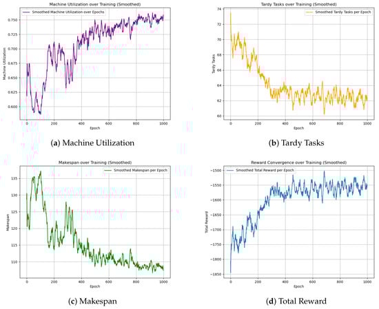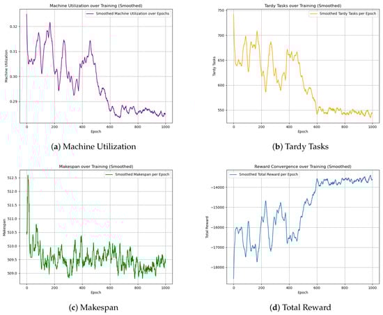 The experimental results confirmed the favorable scheduling performance and stability of the GA-HPO PPO algorithm across both 100-task and 1000-task scenarios, generally demonstrating improved performance compared to benchmark methods such as DDQN, standard PPO, and rule-based heuristics. A key strength of the GA-HPO PPO approach is its ability to notably reduce the number of tardy tasks, which were significantly lower than that of the other models evaluated. The algorithm also exhibited observable benefits in minimizing task delays, reducing makespan, and optimizing the machine load distribution, thereby supporting efficient resource utilization and timely task completion. These outcomes align with and extend the findings of earlier studies that integrated metaheuristics with reinforcement learning, such as hybrid GA-Tabu Search approaches [] and self-learning genetic algorithms [], through the introduction of a more adaptive and automated hyperparameter optimization framework.
