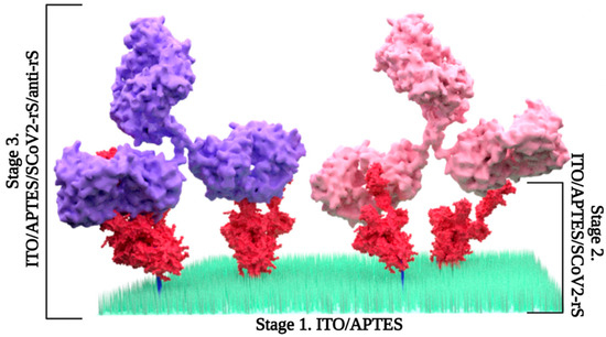 Schematic representation of the experimental stages. Stage 1—formation of SAM resulting in ITO/APTES; stage 2—incubation with SCoV2-rS with formation of ITO/APTES/SCoV2-rS; stage 3—anti-rS coupling resulting in ITO/APTES/SCoV2-rS/anti-rS formation.