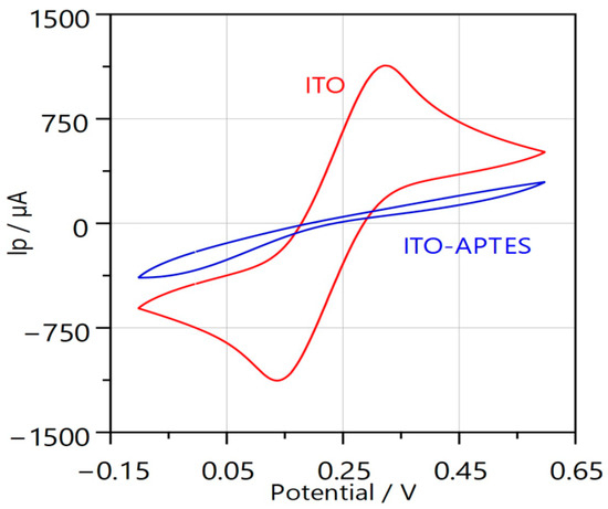 Electrochemical measurements were performed to characterize the ITO and ITO/APTES surfaces in a 10 mL electrochemical cell containing a PBS solution, pH 7.4, and 2.5 mM of the redox probe K4[Fe(CN)6]/K3[Fe(CN)6]. The redox probe was used only for surface characterization measurements. Potential cycling was performed in the range from −0.1 V to +0.6 V at a scan rate of 0.1 V/s and a step size of 0.005 V. In total, 5 potential cycles were applied to characterize the surface. The 5th cycle was accepted as characteristic of the system.