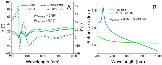 Further, to determine the thickness of the formed APTES layer, an optical model based on regression analysis was applied. This model consisted of a glass substrate and a 168.97 nm ITO layer on top. The ITO layer in the optical model was characterized using ITO optical constants dispersion from the Complete EASE database. The ITO layer thickness was a free-fitting value. After that, the optical model was extended by adding an APTES layer on top of ITO. This layer was characterized using the Cauchy dispersion function with the following fixed parameters: A = 1.546, B = 0.010, and C = 0. The dispersion curves of the ITO and APTES refractive index are presented in Figure 4B. The thickness of the APTES layer was a free-fitting value. After the fitting procedure, it was obtained that the APTES layer thickness was 4.32 nm, which is in good agreement with the literature [50].