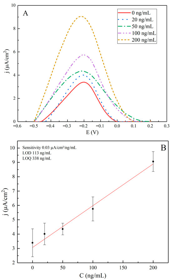 (A) Square wave voltammograms with baseline correction of ITO/APTES/SCoV2-rS/anti-rS in the range of concentrations from 0 to 200 ng/mL. Measurements were performed with the following parameters: potential window from −0.6 to +0.3 V, a step size of 0.005 V, a modulation amplitude of 0.025 V vs. Ag/AgCl(KCl3Ms), and frequency of 20 Hz in a 0.1 M PBS solution. The signal was normalized to the electrode area of 0.196 cm2. (B) Calibration curves for SWV: current density (j) vs. anti-rS antibody concentration. Error bars represent standard deviations calculated from three independent measurements.