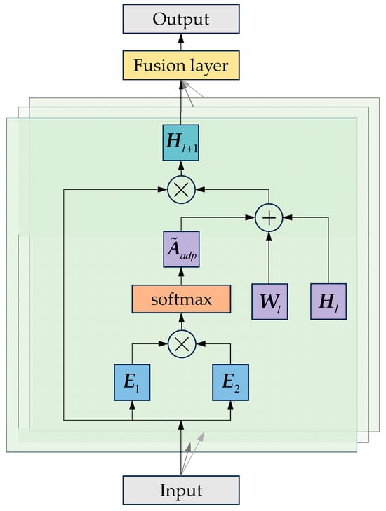where the ReLU activation function is used to ignore weak connections. The softmax function is used to normalize the adaptive adjacency matrix. In our implementation, the final adjacency matrix used in each layer can be regarded as a combination of the initial static adjacency matrix and the learned adaptive adjacency matrix, allowing the model to dynamically learn hidden spatial dependencies during training. The adaptive graph convolution operation is formulated in Equation (3).