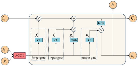 Figure 3 shows the structure of an LSTM network. The adaptive graph convolutional layer first encodes the spatial information and extracts features among nodes. These features are then passed to the LSTM layer, which further processes them along the temporal dimension. The gating mechanisms in the LSTM collaborate to determine which information should be retained, updated, and output.