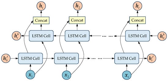 After learning the periodic spatiotemporal distribution information in the encoder, the decoder then utilizes one-layer BiLSTMs to decode the information in both forward and backward directions. Although LSTM is effective in capturing long-term dependencies, it cannot process input sequences in reverse order, which limits its ability to handle future information. BiLSTM consists of a forward LSTM layer and a backward LSTM layer, as shown in Figure 6. These two layers process the input sequence in forward and reverse directions, respectively. The forward and backward hidden states at each time step are merged through concatenation. As a result, the final hidden state contains information from both past and future moments, enabling the model to better understand the contextual relationships within the input sequence. This process is formulated as follows.