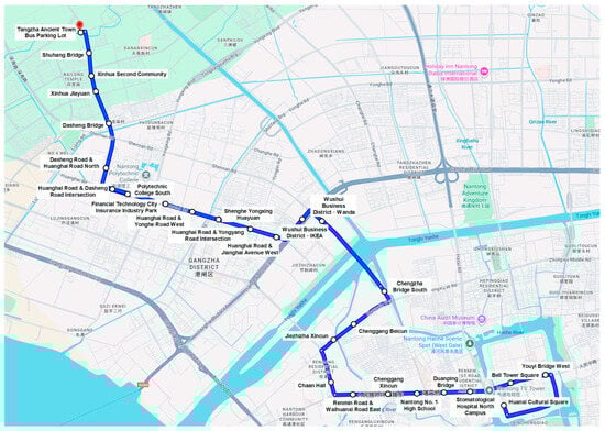 In the case study, numerical experiments based on a real-world single-line bus corridor in China validate the developed framework. The No. 1 bus route of Nantong includes 27 stops. Figure 7 is the Nantong No. 1 bus route map, which is generated based on a screenshot from Google Maps with stop labels added manually. All bus stop IDs and names, the spacing between adjacent stops, as well as cumulative distance are listed in Table 2. The average spacing between adjacent stops is approximately 514 m, which aligns well with the density of Nantong’s downtown road network and pedestrian accessibility standards. The current stop configuration ensures convenient boarding and alighting within the main urban area while maintaining operational efficiency. The data is derived from bus passenger flow IC card records. Passengers are required to swipe their cards both when boarding and alighting. Our experiment uses historical OD passenger flow data in the outbound direction from 2 September to 9 September 2024. Data were collected daily from 5:00 to 21:00 at 30 min intervals. The first seven days of data are used as the training set, and the last day as the test set. 20% of the training set is reserved for validation. The description of the dataset is provided in Table 3. Table 4 presents sample data examples, i.e., passenger flow records between partial OD pairs from 7:30 to 8:00 on September 2. The dataset is indexed by timestamps, and each timestamp corresponding to a 27 × 27 OD matrix.