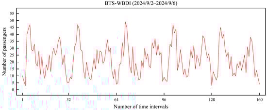 - Passenger flow significantly increases during peak hours. During morning and evening commuting periods, passenger volumes along the entire route rise sharply, with more boarding activity at all stops. Figure 8 shows the variation trend of bus OD demand from Bell Tower Square Stop to Wushui Business District—IKEA Stop between 2 and 6 September 2024. The horizontal axis represents the number of time intervals, with each interval being 30 min, and there are 32 intervals per day. The vertical axis represents the OD demand volume. It can be intuitively observed from the figure that there is a periodic fluctuation in passenger flow. Higher OD demand appears during the morning and evening peak hours, whereas the demand is relatively lower during off-peak hours.