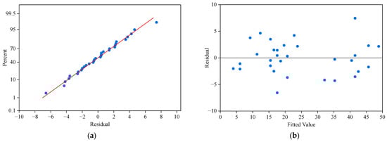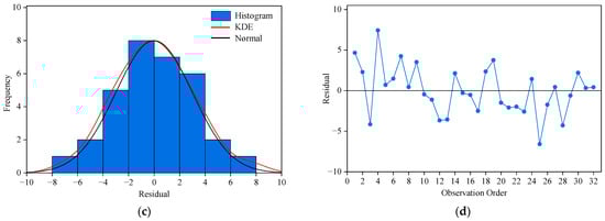 Figure 11 consists of four subgraphs. Figure 11a is the normal probability plot of residuals, where the points are roughly distributed along a straight line, confirming that the residuals approximately follow a normal distribution. Figure 11b is the scatter plot of residuals versus fitted values. The residuals are randomly distributed without an obvious trend, indicating that the model has no systematic bias. Figure 11c shows the residual histogram and kernel density estimation curve, with the black curve representing the normal distribution curve. This graph reveals that the residuals are approximately normally distributed and concentrated around zero, suggesting a reasonable error distribution. Figure 11d is the plot of residuals changing with the observation order. There is no obvious temporal correlation among residuals, indicating good stability of the model.