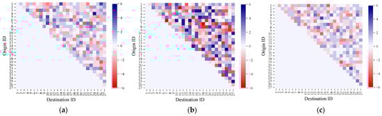 Real and predicted OD demand differences during peak and off-peak hours. (a) Difference heatmap 7:30–8:00. (b) Difference heatmap 12:30–13:00. (c) Difference heatmap 17:30–18:00.